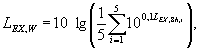 Уровень 8-часового воздействия шума, приведенный к 40-часовой рабочей неделе, LEX,W, дБА, рассчитывают по формуле