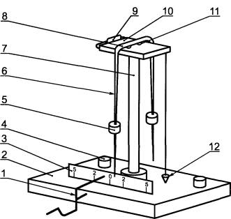1 - пусковой механизм; 2 - основание; 3 - шкала; 4 - установочные винты; 5 - груз; 6 - двустрелочный механизм; 7 - штатив; 8 - соединительная планка; 9 - рамка; 10 - столик; 11 - стальные шарики; 12 - отвес Определение «стеклянного числа» проводят при температуре (20 ± 2) °С и относительной влажности воздуха (65 ±5 ) %. Измерения проводят не менее чем на трех участках поверхности стеклянной пластинки. Таким же образом определяют время затухания колебаний маятника на стеклянной пластинке с испытуемым покрытием эмали. 3.3б.2.4. Обработка результатов Твердость (Н), условные единицы, вычисляют по формуле: