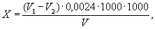 где V1 - объем раствора соляной кислоты, израсходованный на титрование с фенолфталеином, см3; 0,0030 - масса карбонатов, эквивалентная массе соляной кислоты в 1 см3 раствора с молярной концентрацией эквивалента 0,1 моль/дм3, г; V - объем исследуемого раствора, взятый для анализа, см3. 7.2.3.2. Массовую концентрацию гидрокарбонатов X, мг/дм3, вычисляют по формуле
