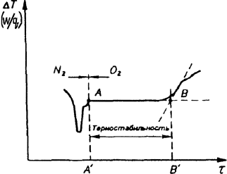 При разногласиях образцы изготовляют механической обработкой. При изготовлении ось образца-лопатки должна быть параллельна оси трубы. Перед испытанием образцы кондиционируют при стандартной атмосфере 23 по ГОСТ 12423 не менее 2 ч. При расчете относительного удлинения при разрыве по изменению расстояния между зажимами эквивалентную длину lэкв для образца типа 1 принимают равной 33 мм, для образца типа 2-60 мм. (Измененная редакция, Изм. № 1, Изм. № 3). 8.6 Определение изменения длины труб после прогрева - по ГОСТ 27078 при температуре (110±2)°С. (Измененная редакция, Изм. № 1). 8.7 Определение стойкости при постоянном внутреннем давлении - по ГОСТ 24157. Для вычисления испытательного давления средний наружный диаметр и толщину стенки образцов определяют в соответствии с 8.4. Расчет испытательного давления проводят с погрешностью 0,01 МПа. 8.8 Определение стойкости к газовым составляющим. Испытание на стойкость труб к газовым составляющим проводят по ГОСТ 24157 на трубах диаметром 32 мм с SDR 11. Испытуемый образец заполняют вместо воды синтетическим конденсатом, состоящим из смеси 50% вес. н-декана и 50% вес. 1, 3, 5-триметилбензола с содержанием основного вещества в указанных компонентах ≥95 %. Перед испытанием образцы, заполненные конденсатом, выдерживают в воздушной среде в течение 1500 ч при температуре (23±5)°С. Образцы в водной среде при температуре 80°С должны выдерживать без признаков разрушения постоянное внутреннее давление, соответствующее начальному напряжению в стенке грубы 2 МПа в течение 20 ч. (Измененная редакция, Изм. № 1, Изм. № 3). 8.9 Определение термостабильности 8.9.1 Аппаратура Дифференциальный термический анализатор или дифференциальный сканирующий калориметр, поддерживающий температуру испытания с погрешностью ±0,5°С. Весы лабораторные с погрешностью взвешивания до 0,1 мг. Баллон по ГОСТ 949 с азотом по ГОСТ 9293, баллон с кислородом по ГОСТ 5583, которые можно включать попеременно. Ротаметры для измерения расхода газа по ГОСТ 13045. (Измененная редакция, Изм. № 1). 8.9.2 Подготовка к испытанию Из сегмента трубы (или от гранул) отрезают образец массой (15+0,5) мг. Количество образцов - не менее двух. (Измененная редакция, Изм. № 1, Изм. № 3). 8.9.3 Проведение испытания В камеру термического анализатора помещают открытую алюминиевую чашку с образцом и пустую алюминиевую эталонную чашку. При работе со сканирующим калориметром измерительную ячейку закрывают крышкой с отверстием. Через камеру прибора пропускают азот со скоростью 50 мл/мин±10%. Камеру прибора нагревают до температуры (200±0,5)°С со скоростью 20°С/мин. Затем включают запись термограммы, на которой строится график зависимости разности температур DТ от времени t или теплового потока W/q от времени t (рисунок 1). По истечении пяти минут камеру прибора переключают на подачу кислорода и отмечают эту точку на термограмме (точка А). Запись термограммы продолжают до достижения максимума экзотермой окисления, затем прибор отключают. (Измененная редакция, Изм. № 1). 8.9.4 Обработка результатов К полученной кривой проводят касательную к экзотерме в точке ее максимального наклона до пересечения с продолжением горизонтальной прямой (точка В) и проецируют точки А и В на ось абсцисс. За термостабильность принимают среднее арифметическое времени в минутах, прошедшее от точки А¢ до точки В¢ на двух образцах. Рисунок 1 - Типичная крива