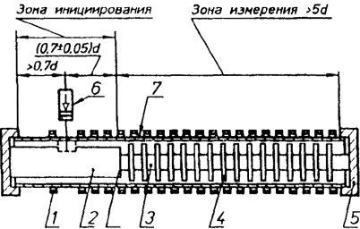 диаметр трубы, рассчитываемый по формуле Шаг перегородок должен быть (0,4-0,1)d. Размеры внутренней оправки в зоне измерения обеспечивают возможность заполнения не менее 70% внутреннего объема испытуемого образца сжатым воздухом; 1 - кольца наружной обоймы; 2 - наковальня; 3 - несущий стержень; 4 - декомпрессионные перегородки; 5 - заглушки; 6 - боек; 7 - испытуемый образец Рисунок 2 манометров для измерения внутреннего статического давления в зоне измерения с погрешностью ±1% и приспособлением для подачи давления внутрь испытуемого образца; заглушек, уплотняющих образец по наружному диаметру, устанавливаемых с обоих концов испытуемого образца. Конструкция заглушек обеспечивает герметичное соединение с образцом и приспособлением для подачи давления; бойка для нанесения удара (рисунки 2 и 3). Лезвие бойка должно проникать на глубину 1,0-1,5 е от наружной поверхности испытуемой трубы. (Измененная редакция, Изм. № 1). 8.10.2 Отбор образцов Испытание проводят на образцах в виде отрезкой труб длиной 7-8d, отобранных от партии в соответствии с 7.2. Длина зоны измерения должна быть больше чем 5d. Наружная и внутренняя поверхности образца в зоне измерения не должны обрабатываться, надрезаться или подвергаться какому-либо воздействию. Перед испытанием определяют условия инициирования трещины на ненагруженных отрезках с длиной зоны измерения не менее 5d, чтобы получить трещину длиной не менее 1d. Скорость удара бойка должна составлять (15±5)м/с. Если трещина не инициируется, на внутреннюю поверхность образца в зоне инициирования бритвой наносят надрез глубиной не менее 1 мм. Испытуемый образец собирают в обойме и кондиционируют при температуре 0-2 ºС термостатированием в водной или в воздушной среде в течение (3 ± 0,25) ч при номинальной толщине образца е<8 мм, (6 ± 0,5) ч при 8≤е<16, (10 ± 1) ч при 16≤е<32 мм и (16±1) ч при е³32 мм. (Измененная редакция, Изм. № 1, Изм. № 2, Изм. № 3).