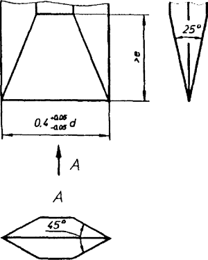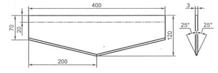 - приспособление для нанесения удара, инициирующего образование трещины в трубе, состоящее из пневмоцилиндра и бойка в виде стального лезвия. Конструкция лезвия, приводимого в движение быстродействующим поршнем пневмоцилиндра, приведена на рисунке 7; Размеры в миллиметрах
