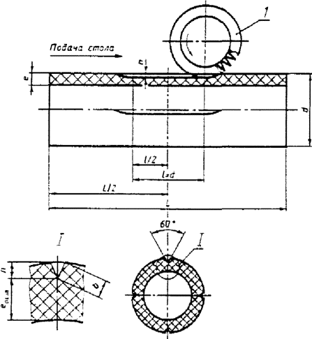 Рисунок 3 8.10.4 Проведение испытания Образец подвергают воздействию постоянного внутреннего давления воздуха Р, поддерживаемого с погрешностью ±1%, и проводят удар бойком в зоне инициирования в соответствии с условиями по 8.10.3. Каждый образец должен быть испытан в течение не более 3 мин после кондиционирования (8.10.3). Длину трещины а измеряют в зоне измерения металлической рулеткой по ГОСТ 7502. 8.10.5 Обработка результатов Создавая различные давления воздуха внутри трубы (выше или ниже ожидаемого значения "критического давления"), получают не менее двух результатов, при которых образуется трещина длиной а£4,7d и при которых длина трещины составляет а >4,7d. Образование трещины длиной а > 4,7 d характеризует начало быстрого распространения трещин. За результат испытания принимают минимальное внутреннее давление воздуха ("критическое давление" Рс), при котором возникает процесс быстрого распространения трещины на образце. Допускается определять стойкость к быстрому распространению трещин маломасштабным методом при испытательном давлении, рассчитанном по таблице 2 для требуемого МОР. Результат испытания считают положительным, если не происходит распространения трещины - максимальная длина трещины а≤4,7d. При этом критическое давление больше испытательного. (Измененная редакция, Изм. № 3). 8.11 Стойкость к медленному распространению трещин d - наружный диаметр трубы; е - толщина стенки трубы; еост - остаточная толщина стенки трубы; l - длина надреза; L - свободная длина образца по ГОСТ 24157; b - ширина надреза; n - глубина надреза; 1 - двусторонняя фреза с углом 60°. Рисунок 4 Определение стойкости к медленному распространению трещин проводят по ГОСТ 24157 на одном образце трубы с четырьмя продольными надрезами, нанесенными на наружную поверхность трубы. Испытание распространяют на трубы с номинальной толщиной стенки более 5 мм. Надрез осуществляют на фрезерном станке, снабженном (для опоры образца по внутреннему диаметру) горизонтальным стержнем, жестко закрепленным на столе. Фрезу (рисунок 4) с режущими V-образными зубьями под углом 60° шириной 12,5 мм устанавливают на горизонтальном валу. Скорость резания должна составлять (0,010±0,002) (мм/об)/зуб. Например, фреза с 20 зубьями, вращающаяся со скоростью 700 об/мин, при скорости подачи 150 мм/мин будет иметь скорость резания 150/(20´700)=0,011 (мм/об)/зуб. Фрезу не следует использовать для других материалов и целей и после нанесения надреза длиной 100 м ее заменяют. Определяют минимальную толщину стенки по 8.4.4 и отмечают место первого надреза, затем наносят метки, обозначающие места трех последующих надрезов, которые должны располагаться равномерно по окружности трубы и на равном расстоянии от торцов. По линиям меток измеряют толщину стенки с каждого торца и рассчитывают среднюю толщину стенки для каждой линии надреза е. По таблице 5 выбирают значение остаточной толщины стенки еост В миллиметрах