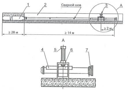- деревянную вставку длиной 0,5 м, поддерживающую изнутри под канавкой испытуемую трубу и предотвращающую ее деформацию в процессе инициирования трещины. Верхняя часть вставки должна иметь углубление, которое заполняют упругим вспененным материалом для того, чтобы фиксировать положение деревянной вставки по отношению к канавке, в том числе при деформации трубы в процессе ее нагружения испытательным давлением, а также обеспечить охлаждение всей толщины трубы под канавкой, изолируя эту часть трубы от среды, подающей давление. (Введен дополнительно, Изм. № 3). 8.12.2 Подготовка к испытанию На испытуемой трубе обрабатывают канавку в соответствии с рисунком 6 и размещают деревянную вставку под канавкой. При этом центр канавки должен находиться на расстоянии не менее 2 м от конца трубы. На конец испытуемой трубы у канавки устанавливают заглушку. Прямые отрезки труб сваривают встык для получения образца длиной не менее 14 м, включая отрезок трубы с нанесенной канавкой, грат не удаляют. Испытуемую трубу помещают в канал, соединяют с металлическим ресивером, измеряют длину трубы от центра инициирования до места соединения с ресивером рулеткой по ГОСТ 7502 и кондиционируют при (0±1,5) ºС в течение (6±0,5) ч при толщине стенки трубы е<16 мм, (10±1) ч при 16≤е<32 мм и (16±1) ч при е≥32 мм. Температуру измеряют с интервалом не более 2 м вдоль любой стороны трубы от конца деревянной рамы к стальному ресиверу. (Введен дополнительно, Изм. № 3). 8.12.3 Проведение испытания Испытуемую трубу охлаждают в зоне инициирования трещины смесью твердой двуокиси углерода с незамерзающей жидкостью до температуры минус 60 °С в течение не менее 1 ч. Затем создают давление в испытуемой трубе и ресивере с погрешностью ±2 %, рассчитанное по таблице 2 для требуемого МОР. Удаляют устройство для охлаждения канавки и инициируют образование трещины ударом металлического лезвия, расположенного вдоль канавки, по охлажденной канавке в центре ее полной глубины в месте расположения деревянной вставки. Ход бойка должен обеспечивать прорезание стенки трубы на длину лезвия (400 мм). Удар наносят не позднее чем через три минуты после нагружения трубы испытательным давлением. Затем измеряют длину разрушенного участка трубы, включая длину трещины от центра ее инициирования, рулеткой по ГОСТ 7502. При этом трещина не должна заканчиваться на сварном шве. В этом случае образец заменяют другим и испытывают вновь. (Введен дополнительно, Изм. № 3). 8.12.4 Обработка результатов Рассчитывают отношение длины разрушившегося участка в процентах к длине испытуемой трубы, измеренной от центра инициирования трещины. Результат испытания считают удовлетворительным, если при испытательном давлении, рассчитанном по таблице 2 для требуемого максимального рабочего давления МОР, наибольшая длина разрушившегося участка меньше или равна 90 % от длины испытуемой трубы. Длина разрушения трубы более 90 % длины испытуемой трубы, xaрактеризующая процесс быстрого распространения трещин, является отрицательным результатом. (Введен дополнительно, Изм. № 3). 9 ТРАНСПОРТИРОВАНИЕ И ХРАНЕНИЕ9.1 Трубы не относят к категории опасных грузов в соответствии с ГОСТ 19433 и транспортируют любым видом транспорта в соответствии с правилами перевозки грузов, действующими изданном виде транспорта. При железнодорожных перевозках трубы длиной до 5,