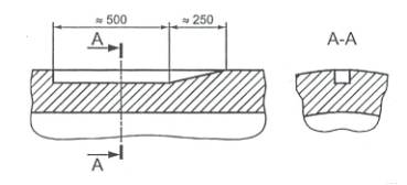 Стальной ресивер, минимальной длиной в два раза превышающей длину испытуемой трубы, и объемом, в три раза большим объема испытуемой трубы. Внутренний диаметр присоединительного участка ресивера должен иметь диаметр больший или равный внутреннему диаметру испытуемой трубы. Система для создания давления с погрешностью ±2 % от заданного давления в испытуемой трубе и стальном ресивере. В качестве среды испытания используют азот или воздух. Оборудование для инициирования трещины, включающее: - фрезу для механической обработки продольной канавки на наружной поверхности трубы шириной »10 мм, глубиной »80 % от номинальной толщины стенки трубы, длиной »500 мм с равномерным уменьшением глубины канавки до выхода ее на наружную поверхность трубы в направлении стального ресивера на длине »250 мм (рисунок 6). Длина трубы, на которой выполняется канавка, должна быть не менее 3 м. Центр канавки с постоянной глубиной должен находиться на расстоянии не менее 2 м от заглушаемого конца трубы;
