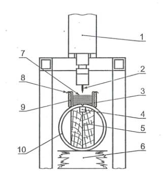 1 – пневмоцилиндр; 2 – лезвие; 3 – канавка; 4 – упругий материал; 5 – деревянная вставка; 6 - опора; 7 – охлаждающая жидкость; 8 – полиэтиленовая пленка; 9 – деревянный лоток; 10 - испытуемая труба