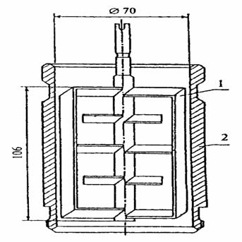 1 - лопастное устройство; 2 - стакан Рисунок 1 - Смеситель лопастной При ручном приготовлении цемент высыпают в чашу, предварительно протертую влажной тканью. Затем делают в цементе углубление, в которое вливают в один прием воду. Углубление засыпают цементом и через 30 с после приливания воды сначала осторожно перемешивают, а затем энергично растирают тесто лопаткой. Для всех тампонажных цементов, за исключением гидрофобизированных, продолжительность перемешивания и растирания с момента приливания воды составляет (180 ± 10) с; для гидрофобизированных цементов - (300 ± 10) с. 3.14 Режим испытаний3.14.1 Для всех типов цемента в зависимости от температуры применения режим испытаний для определения времени загустевания и режим твердения для определения прочности при изгибе и сжатии должен соответствовать требованиям, указанным в таблице 2.