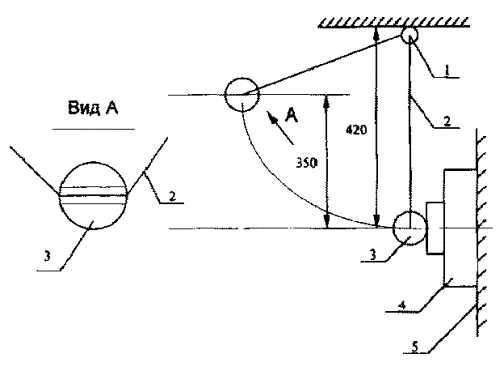 1 - горизонтальная штанга; 2 - нить маятника; 3 - латунный шар; 4 - испытуемый шар; 5 - опора Испытуемый извещатель (4) жестко закрепляют в рабочем положении на опоре (5) при помощи собственных устройств крепления и подключают к пожарному приёмно-контрольному прибору или прибору, его заменяющему, в соответствии с инструкцией изготовителя. Извещатель должен быть закреплён таким образом, чтобы падающий латунный шар попадал в центр хрупкого элемента извещателя (отклонение не более 5 мм). Латунный шар (3), подвешенный на нити (2), которая жёстко закреплена на горизонтальной штанге (1), поднимают на высоту (350 ±10) мм таким образом, чтобы нить маятника оставалась натянутой. После этого шар отпускают. Шар должен нанести удар по хрупкому элементу только один раз. СОДЕРЖАНИЕ