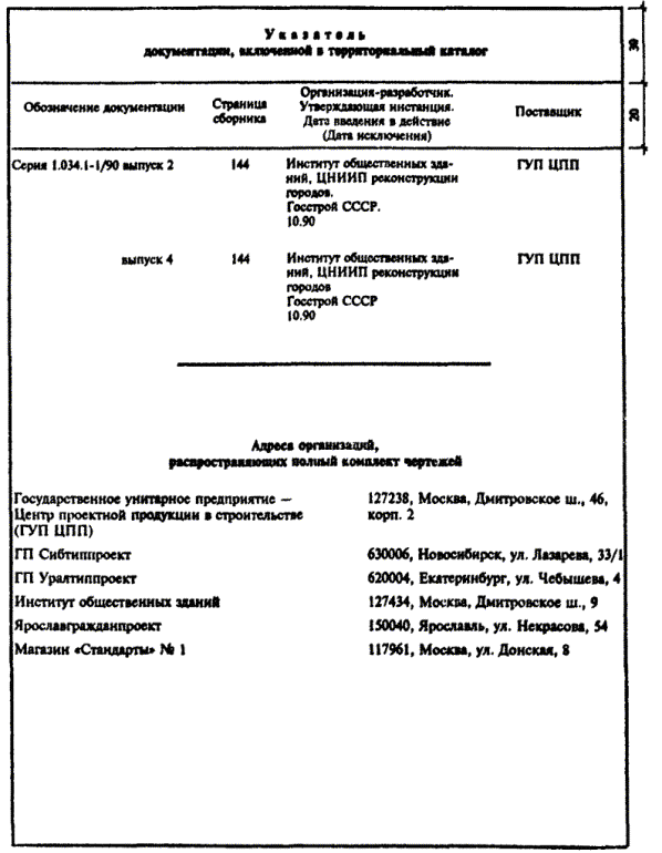 МИНИСТЕРСТВО СТРОИТЕЛЬСТВА РОССИЙСКОЙ ФЕДЕРАЦИИ МЕТОДИЧЕСКИЕ УКАЗАНИЯ Утверждены Минстроем Российской Федерации Государственное унитарное предприятие ЦЕНТР ПРОЕКТНОЙ ПРОДУКЦИИ В СТРОИТЕЛЬСТВЕ Москва 1996 Методические указания по разработке территориальных каталогов конструкций и изделий для строительства / ГУП ЦПП Минстроя РФ. - М.: ГУП ЦПП Минстроя РФ, 1997. РАЗРАБОТАНЫ Государственным унитарным предприятием - Центр проектной продукции в строительстве Минстроя России (ГУП ЦПП). ПОДГОТОВЛЕНЫ К УТВЕРЖДЕНИЮ Департаментом развития научно-технической политики проектно-изыскательских работ Минстроя России. УТВЕРЖДЕНЫ Министерством строительства Российской Федерации. ВВОДЯТСЯ в действие с 1 января 1997 г. С введением в действие «Методических указаний по разработке территориальных каталогов конструкций и изделий для строительства» утрачивают силу «Временные методические указания по разработке и распространению территориальных каталогов индустриальных конструкций и изделий для различных видов строительства» (1990). 1. ОБЩИЕ ПОЛОЖЕНИЯ1.1. Настоящие Методические указания содержат общие требования к составу, оформлению, согласованию, утверждению, изданию и распространению территориальных каталогов конструкций и изделий* для промышленного, жилищно-гражданского и сельскохозяйственного производственного строительства**, а также определяют порядок внесения в них изменений и дополнений. * Далее - изделий. ** Далее - территориальные каталоги. 1.2. Территориальные каталоги предназначены для организации и функционирования единой информационно-справочной системы, охватывающей деятельность строительного комплекса в каждом субъекте (территории) Российской Федерации в части производства строительных конструкций и изделий. 1.3. Территориальные каталоги являются рекламно-информационным материалом, предназначенным для использования заказчиками, проектными и подрядными организациями, предприятиями строительной индустрии и другими юридическими и физическими лицами - участниками инвестиционного процесса в области капитального строительства. Непрерывность действия и актуализация территориальных каталогов, а также своевременность их издания должны обеспечиваться службой ведения территориальных каталогов в организациях-разработчиках при методическом содействии, если это необходимо, Центра проектной продукции в строительстве (ГУП ЦПП). 1.4. Утвержденные территориальные каталоги являются постоянно действующими официальными документами, отражающими номенклатуру основных строительных изделий из различных материалов, изготавливаемых на данной территории предприятиями стройиндустрии различного подчинения и форм собственности. По мере необходимости в них могут вноситься изменения и дополнения, связанные с освоением предприятиями стройиндустрии новых эффективных и прекращением производства устаревших изделий, с изменением потребностей строительства, развитием строительной базы. 1.5. Территориальные каталоги разрабатываются для каждого субъекта Федерации: республики, края, области городов - Москва и Санкт-Петербург. 1.6. В обозначении (шифровке) территориальных каталогов отражается: административно-территориальное деление Российской Федерации (республика, край, область, город), вид строительства (промышленное, жилищ