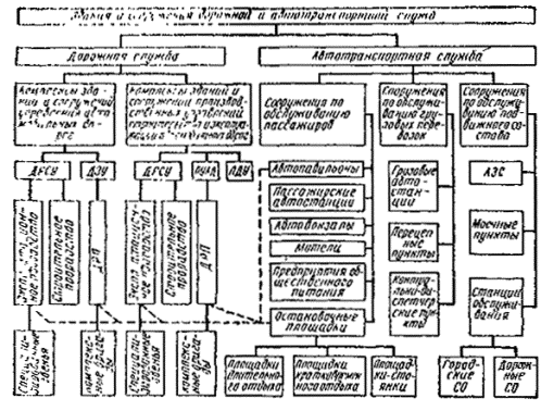1.6. Для обеспечения обслуживающего персонала необходимыми бытовыми удобствами (школа, магазины, жилье, культурно-бытовые учреждения и т.д.) линейные сооружения и комплексы автотранспортных и дорожных служб целесообразно размещать у населенных пунктов. 1.7. При расположении сооружения в условиях, требующих возведение жилых строений для обслуживающего персонала, нормы обеспечения жилой площадью принимаются по СНиПу. 1.8. Вопросы общественного питания, медицинского обслуживания, пожарной охраны в отдельных случаях могут решаться путем кооперирования с местными предприятиями и организациями. 1.9. Автомобильная дорога с размещенными на ней сооружениями автотранспортной и дорожной служб должна быть обеспечена ведомственной линейной радиотелефонной и телефонной связью. Для обеспечения связи с автотранспортной и дорожной службами непосредственно с дороги, что необходимо в экстренных случаях, рекомендуется устройство телефонных установок на перегонах. Проектирование дорожной линейной связи выполняется по специальному заданию с учетом действующих норм и правил проектирования и эксплуатации средств связи. 1.10. Пункты ГАИ не входят в систему автотранспортной и дорожной служб на автомобильных дорогах общего пользования. Пункты ГАИ, как правило, размещаются на входах в крупные, города (областные и областного подчинения), а также на пересечениях автомобильных дорог I-III категорий. Местоположение их устанавливается Областным управлением ГАИ. При пунктах ГАИ должны устраиваться площадки-стоянки для служенных транспортных средств и автомобилей, останавливаемых для контроля. 1.11. Руководство и планирование обустройства дорог сооружениями автотранспортной и дорожной служб осуществляется дорожными органами Минавтодора РСФСР. РАЗДЕЛ 2. КЛАССИФИКАЦИЯ СООРУЖЕНИЯ2.1. Для обеспечения нормальной эксплуатации, ремонта и содержания всех автомобильных дорог и дорожных сооружений, а также обслуживания автотранспортных средств и пассажиров, двигающихся по автомобильным дорогам, обязательной принадлежностью автомобильных дорог должны быть сооружения дорожно-эксплуатационной и автотранспортной служб. 2.2. К сооружениям линейной дорожно-эксплуатационной службы в зависимости от установленной организационной структуры ее относятся комплексы зданий: дорожно-ремонтных строительных управлений (ДРСУ); дорожно-эксплуатационных участков (ДЭУ); линейных управлений автомобильных дорог (ЛУАД); производственных дорожных участков (ПДУ); дорожно-ремонтных пунктов (ДРП); пунктов охраны больших мостов и содержания паромных переправ. 2.3. Сооружения автотранспортной службы на автомобильных дорогах разделяются на три группы: сооружения для обслуживания пассажирских перевозок; сооружения для обслуживания грузовых перевозок; сооружения для обслуживания подвижного состава. 2.4. К сооружениям для обслуживания пассажирских перевозок относятся: автопавильоны; пассажирские автостанции; автовокзалы; мотели; предприятия общественного питания; остановочные площадки. 2.5. К сооружениям для обслуживания грузовых перевозок относятся: грузовые автостанции; перецепные пункты; контрольно-диспетчерские пункты. 2.6. К сооружениям для обслуживания подвижного состава относятся: станции обслуживания; автозаправочные станции; моечные пункты. А. Сооружения доро
