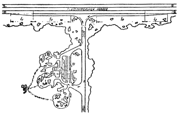 Рис.8 Пример (схема) размещения станции обслуживания автомобилей, автозаправочной станции на примыкании дороги III категории к дорогам I-II категории. Размеры полос торможения и разгона определяются по СНиП II-Д.5-72. Сантехнические устройства и пункт питания включен в комплекс СО