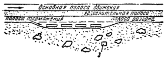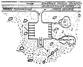 Количество и протяженность дорог, находящихся в эксплуатации у ЛУАД, определяется по территориальному признаку в пределах административного района. В проектах автомобильных дорог в случае необходимости в соответствии с заданием предусматривается строительство комплексов ДРП, ДРСУ, ЛУАД. 3.16. Для увеличения эффективности капиталовложений можно предусматривать стадийное осуществление обустройства автомобильных дорог. При этом на первой стадии строительства следует предусматривать строительство всех сооружений, которые должны обеспечивать необходимые услуги для пассажиров, водителей, туристов и по уходу за подвижным составом, а также требуемую безопасность движения с учетом потребности на 10-летнюю перспективу. На последующие стадии строительства могут относиться: расширение емкостей площадок отдыха и стоянок; увеличение пропускной способности (мощности) АЗС, СО, автостанций и других сооружений, а также дополнительные мероприятия по увеличению безопасности движения а связи с ростом интенсивности движения. РАЗДЕЛ 4. РАЗМЕЩЕНИЕ СООРУЖЕНИЙ ОТНОСИТЕЛЬНО ДОРОГИ4.1. Размещение сооружений должно производиться на основе экономического и статистического обследований района тяготения с учетом перспективы. Принимаются во внимание частота размещения и характер населенных пунктов, грузо- и пассажирообразующие узловые пункты, предприятия промышленности и сельского хозяйства, архитектурные, исторические и другие памятники и примечательные места, участки, привлекающие туристов, а также местные условия. 4.2. После выбора мест для сооружений и определения рациональных расстояний между ними и возможного объединения различных комплексов на общей и соседних площадках необходимо предусмотреть мероприятия по обеспечению нормальной работы сооружений и благоприятных условий проезда транспортных средств в их зоне. К таким мероприятиям относятся: правильное размещение площадок под сооружения относительно дороги, обеспечение удобства и безопасности подъезда к сооружению и выезда от него на дорогу. Последнее достигается обязательным устройством дополнительных полос торможения и разгона при строительстве каждого сооружения или группы их. Некоторые примеры общих принципиальных решений и приемов установки и привязки сооружений к дороге даны в прилагаемых схемах. В каждом конкретном случае в зависимости от местных условий рекомендуемые схемы могут корректироваться с соблюдением условий безопасности движения. Не удовлетворяющие основным требованиям подъезды к существующим сооружениям должны быть соответственно улучшены или перестроены. В особо неблагоприятных условиях может потребоваться перенос сооружения в другое место. 4.3. По условиям безопасности движения полосы торможения и разгона, устраиваемые у съездов к сооружениям и автобусным остановкам, должны просматриваться водителем на всем их протяжении. 4.4. Не следует располагать сооружения: на участках с уклоном более 40 %; на горизонтальных кривых радиусами менее 1000 м; на выпуклых вертикальных кривых с радиусом меньше 10000 м; ближе 250 м от железнодорожных переездов; на участках с насыпями более 1,5 м; на участках, где расчетный коэффициент безопасности меньше 0,7 или где строительство сооружения приведет к созданию условий, при которых коэффициент безопасности будет 