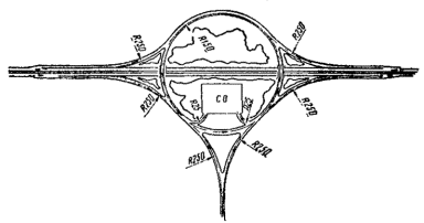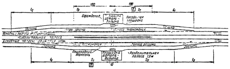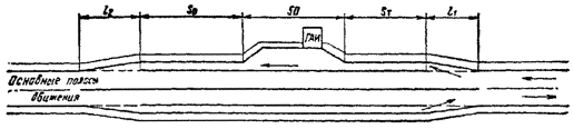 Рис. 10 Пример (схема) съезда и въезда с дороги III категории в район группового размещения сооружений с местным проездом Размеры l1, Sт, Sр и l2 определяются по СНиП II-Д.5-72