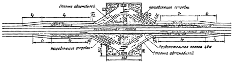 Рис. 6. Пример (схема) островного размещения автозаправочной станции на дороге I категории. Размеры l1, Sт, Sр и l2 определяются по СНиП II-Д.5-72