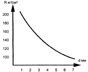 Рис. 1. Тарировочная зависимость размера отпечатка от прочности бетона При использовании молотка Кашкарова (эталонный молоток НИИМосстроя) определяется среднеарифметическое значение отношения размеров отпечатков (лунок) на поверхностях конструкции и эталонного стержня, перемещаемого после каждого удара в отверстии ударной части молотка; прочность материала в этом случае определяется по тарировочной кривой- среднеарифметическое значение отношений размера отпечатка на эталоне к размеру отпечатка на поверхности конструкции (рис. 2).