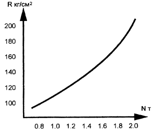 Рис. 3. Тарировочная зависимость усилия вырыва от прочности бетона Величина вырывного усилия определяется по шкале манометра. Переход от косвенных показателей прочности к значению действительной прочности материала в конструкции производится по тарировочным кривым. Прибор ГПНВ-5 может быть применен при проведении комплексных испытаний. Для этого используются выдвижные ножки прибора с шариковыми опорами; в результате применения прибора в таком виде получают второй косвенный показатель прочности - диаметр отпечатка. Прибор ГПНВ-5 разработан и изготовляется Донецким ПромстройНИИпроектом. Следует отметить, что если ударным способом можно определить прочность материала только на поверхности конструкции, то при вырыве закладной детали из конструкции определяется интегральное значение прочности материала на глубину разъемного конуса или стержня, что приближает результаты испытаний к реальным условиям.