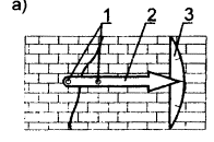 Пластины изготавливаются из пластмассы с делениями и без них Рис. 3. Методика установки маяков: а) рычажных, б) алебастровых, в) пластинчатых 1.3. Компенсационный метод. К механическим методам испытаний относится способ определения напряженного состояния материала массивных конструкций, предложенный В. И. Кравцовым и С. Я. Эйдельманом. Этот метод заключается в следующем. Ниже сечения, по которому определяется напряжение, фиксируется по паре точек, расстояние между которыми замеряется с точностью до 0,01 мм. Затем над одной парой точек пробивается борозда на глубину 30 ± 40 см, что приводит к разгрузке поверхностного слоя конструкции. В этом случае расстояние между точками этой пары увеличивается. После этого производится загружение материала конструкции при введении в борозду компенсатора, представляющего собой стальное жесткое кольцо, перекрытое с двух сторон гибкой или жесткой мембраной, до тех пор, пока расстояние между точками становится равным первоначальному. При этом давление, создаваемое компенсатором, принимается равным напряжению конструкции в этом сечении. 1.4. Метод контроля трещин в конструкциях. 1.4.1. Контроль над трещинами осуществляется с помощью маяков - цементных и алебастровых, рычажных и пластинчатых. Маяки ставятся на очищенную поверхность конструкции перпендикулярно трещине: цементные и алебастровые - не менее двух на трещину и на каждый метр по одному маяку, остальные - на каждые 3 метра по одному маяку, но не менее одного маяка на трещину. На конструкции и в специальном журнале отмечается номер и дата установки маяка; в журнале, кроме того, записывается ширина раскрытия трещины и приводится схема установки маяков (рис. 3). При разрыве цементного или алебастрового маяка, что свидетельствует о развитие трещины, ставятся новые маяки, и в журнале указывается дата появления разрыва. Наблюдение за маяками и установка новых маяков продолжается до прекращения развития трещины. 2. Неразрушающие методы испытаний. 2.1. Ультразвуковой метод. Для определения акустических характеристик материала применяется электронно-акустическая аппаратура, в состав которой входят микро секундомер, датчики-приемники импульсов и токоподводящие проводы. При импульсных акустических (ультразвуковых) испытаниях измеряемой характеристикой является время прохождения акустического сигнала между датчиком и приемником в испытываемом материале. На экране электронно-лучевой трубки время определяется в интервале между зондирующим импульсом и моментом прохождения соответствующей волны. Чтобы определить истинное время распространения волны, следует учитывать потери времени, связанные с обработкой информации в приборе. Эти потери оцениваются двумя способами: первый - перед началом испытаний поверхность датчика и приемника прижимают друг к другу и определяют время между зондирующим импульсом и первым вступлением приходящей волны. Измеряемое время и есть определяемые потери; второй - на эталонном однородном материале производят прозвучивание с базой измерения в 50 и 100 см. В этом случае где