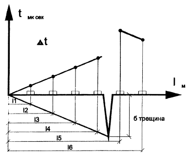 Перед началом прозвучивания следует определить однородность испытываемого материала, для чего при поверхностном прозвучивании измеряют базу измерения. По данным испытаний строятся годографы продольной волны. Прямолинейный характер годографа свидетельствует о постоянной скорости независимо от базы измерения. При этом, для определения глубины распространения трещины, выходящей на поверхность конструкции, используется способ построения годографа. По локальному увеличению времени (разрыв годографа) прохождения акустического импульса в зависимости от базы измерения при фиксированном положении датчика вычисляется глубина проникания трещины (рис. 4). Невидимые дефекты конструкций (пустоты, инородные включения и т. д.) и зона их распространения выявляются при сквозном прозвучивании методом последовательного приближения, т. е. при перемещении датчиков и приемников вдоль поверхности конструкции определяются границы дефектов по локальному изменению скорости ультразвука.