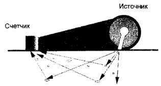 Рис. 5. Схема поверхностного просвечивания (рассеяния) При определении плотности материала, в конструкции при возможном подходе к ней с одной стороны используется метод рассеяния, при котором источник излучения и счетчик импульсов находится у одной и той же поверхности конструкции. В качестве датчика для определения плотности применяется выносной элемент типа ИП-3. В качестве счетно-запоминающего устройства применяется радиометры типа Б-3 или Б-4. При определении плотности материала в конструкции необходимо иметь в виду величину насыщения (минимальную толщину конструкции), при которой возможно определение плотности материала методом рассеяния. Значение этой величины для Е = 1,25 мэв и Е = 0,66 мэв при испытании различных материалов представлены в таблице 5.1. Таблица 5.1. Значение глубины насыщения
