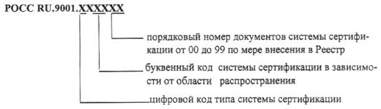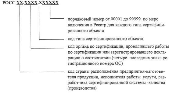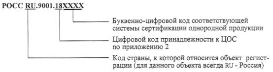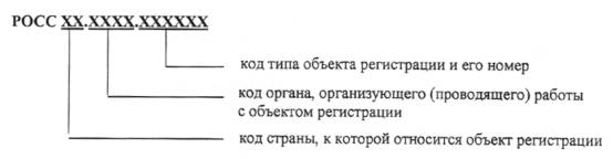 · Аббревиатура РОСС означает принадлежность к Российской Федерации. · Код страны определяют согласно общероссийскому классификатору стран мира двумя заглавными буквами латинского алфавита. · Код органа, организующего (проводящего) работы с объектом регистрации: - для объектов и участников Системы (за исключением сертификатов соответствия) - Госстандарт России - 0001 Госстрой России - 9001 - для сертификатов соответствия, выдаваемых в Системе и регистрируемых деклараций о соответствии - орган по сертификации - последние 4 знака регистрационного номера ОС. · Код типа объекта регистрации и его номер определяются конкретным типом объекта или участника Системы и его порядковым номером при регистрации. Код типа объекта регистрации состоит из цифровых, буквенных, буквенно-цифровых кодов, идентифицирующих этот объект, и устанавливается в соответствии с приложением 2.