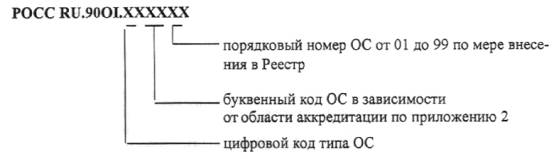 · Код типа органа по сертификации 10 - орган по сертификации (сертификационный центр) со смешанной областью аккредитации, включающей разные типы объектов сертификации; 11 - орган по сертификации продукции; 12 - орган по сертификации услуг; 13 - орган по сертификации систем качества; 14 - орган по сертификации производств; 19 - орган по сертификации уполномоченный · Буквенный код, характеризующий область аккредитации ОС, присваивается в соответствии с приложением 2 данного документа. 2. Структура записи информации в Реестре