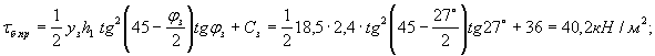 Определяем нагрузку от трения грунта по боковым поверхностям ленточного фундамента. Заглубление фундамента в грунт с наружной стороны знания h1 = 2,4 м, со стороны подвала h2 = 0,55 м. В соответствии с п. 8.22 расчет производим для каждой из сторон фундамента с последующим суммированием усилий. Грунт обратной засыпки при плотности 1850 кг/м3, влажности 20 %, времени эксплуатации до подработки 10 лет характеризуется следующими данными (табл. 9): tg jз = 0,508; jз = 27°; Сз = 36 кПа. Для мягкопластичного суглинка засыпки по табл. 8 принимаем m = 0,3. Предельное сопротивление сдвигу грунта засыпки по боковой поверхности фундамента определяем по формуле (29): при h1 = 2,4 м