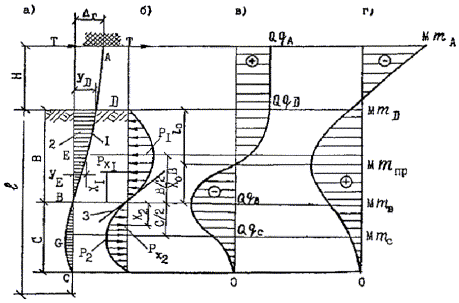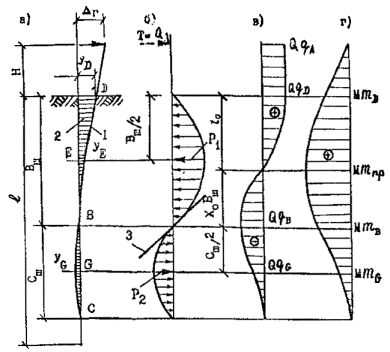 Расчетные максимальные значения перерезывающей силы и изгибающего момента в свае определяем по формулам (59) и (60)