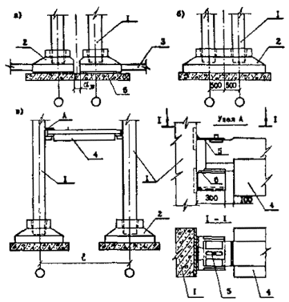 Рис. 15. Конструкция деформационных швов. а - постановка парных рам при наличии связей-распорок между фундаментами; б - то же, при отсутствии связей-распорок; в - с применением подвижных опираний балок; 1 -колонна; 2 - фундамент; 3 - связь-распорка; 4 - балка (ригель); 5 - деталь крепления с овальным вырезом; 6 - шов скольжения 9.11 Выполнение деформационных швов производится с учетом следующих требований: деформационный шов выполняется постановкой двух парных поперечных стен по аналогии с бескаркасными зданиями, если разделяемые деформационным швом отсеки не связаны между собой функционально (рис. 16а); при необходимости сообщений между отсеками могут рекомендоваться короткие переходы в виде однопролетных галерей с устройством шва скольжения на одной из опор (рис. 16б); при устройстве деформационного шва в пределах функционально неразделимого помещения рекомендуется проектировать зазоры в ограждающих конструкциях, заполняемые упругим теплоизоляционным материалом и перекрываемые с наружной и внутренней сторон нащельниками, а также доборные плиты-вставки с одной неподвижной и противоположной скользящей опорами (рис. 16в).