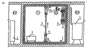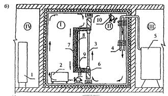 I - теплое отделение камеры; II - холодное отделение камеры; III - машинный зал; IV - помещение с измерительной аппаратурой; 1 - система автоматического сбора данных; 2 - нагревательные приборы; 3 - испытываемый оконный блок; 4 - испаритель; 5 - холодильная установка; 6 - теплоизоляционный слой по периметру проема; 7 - калориметр (утепленная приставная камера); 8 - металлическое отражательное покрытие; 9 - спираль нагрева, равномерно распределенная по площади калориметра; 10 - вентилятор Рисунок 1 - Схемы климатической камеры для проведения испытаний: а) при измерении тепловых потоков при помощи тепломеров; б) с помощью приставной калориметрической камеры 6 Отбор и подготовка образцов6.1 Испытания оконных блоков проводят на образцах полной заводской готовности, изготовленных в соответствии с нормативной и технической документацией на эти изделия. 6.2 Отбор образцов осуществляют методом случайной выборки. Для испытаний рекомендуется отбирать не менее двух однотипных образцов. В случае, если отбор образцов производят без участия представителей испытательного центра (лаборатории), об этом делают соответствующую запись в протоколе испытаний. 6.3 Рекомендуемые размеры образцов оконных блоков для испытаний (высота ´ ширина): (15´12) дм и (15´13,5) дм с отношением площади остекления к площади заполнения светового проема не менее 0,5. 6.4 При испытаниях системы профилей (комбинации створок, коробок и других элементов) из них в соответствии с технической документацией на изделия изготавливают образцы оконного блока, в которых светопрозрачную часть заменяют теплоизоляционной плитой толщиной не менее 24 мм из плитного теплоизоляционного материала по ГОСТ 15588. Допускается проводить испытания линейных элементов профилей при обеспечении требований 7.2 и 7.3 настоящего стандарта. При этом размеры образцов, подлежащих испытаниям, должны составлять не менее 900 мм. Торцы полых образцов изолируют при помощи полиэтиленовой липкой ленты по ГОСТ 20477 или другими аналогичными материалами по НД. 6.5 При испытаниях стеклопакетов их монтируют в деревянную или пластмассовую раму соответствующих размеров, при этом толщина брусков рамы должна в два или более раз превышать толщину стеклопакета. Размеры образцов стеклопакетов рекомендуются не менее 0,8´0,8 м. 6.6 Размеры испытываемого образца оконного блока и его деталей измеряют с помощью металлической рулетки, при этом определяют их соответствие размерам, установленным в НД, а также площади светопропускающей Аст и непрозрачной Ар частей конструкции. 7 Подготовка к испытаниям7.1 Подготовку к испытаниям начинают с рассмотрения технической документации на изделия конкретного вида и составления программы испытаний, в которой учитывают конструктивные особенности изделия и устанавливают требования к температурно-влажностному режиму воздуха в теплом и холодном отделениях климатической камеры, при этом принимают решение о выборе метода измерения тепловых потоков и определяют схему размещения датчиков на поверхностях испытываемого образца. 7.2 Образец оконного блока устанавливают в проем перегородки вертикально, без перекосов и деформаций, монтажные зазоры уплотняют пенополистирольным плитным утеплителем по ГОСТ 15588. Толщина утеплителя должна быть больше или равна толщине рамы оконного блока, но не менее 100 мм. После установ