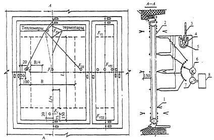 1 - рабочий спай термодатчика; 2 - испытываемый образец; 3 - термометр; 4 - сосуд Дьюара; 5 - холодный спай; 6 - многоточечный переключатель; 7 - микровольтметр; 8 - блок обработки и регистрации данных; FI - FII - термически однородные зоны Рисунок 2 - Схема размещения термопар и тепломеров на образце оконного блока На наружной и внутренней поверхностях образца спаи термопар должны располагаться напротив друг друга по направлению нормали к поверхности. 7.5 Для измерения температуры воздушной среды с теплой и холодной сторон образца оконного блока устанавливают термопары, располагая их на расстоянии 0,15 м от наружной и внутренней поверхностей. Число устанавливаемых термопар должно быть не менее трех с каждой стороны образца. 7.6 При измерении плотности тепловых потоков с помощью тепломеров их устанавливают в центрах однородных температурных зон на внутренней поверхности образца оконного блока. При испытаниях системы профилей (комбинаций створок, коробок) тепломеры устанавливают на поверхностях створок и коробок. Тепломеры должны иметь ширину, не превышающую половины ширины профиля. При испытаниях стеклопакета тепломеры устанавливают в центральной и краевых зонах стеклопакета. Примерные схемы расстановки термопар и тепломеров на образце показаны на рисунке 3. Тепломеры, используемые для измерения плотности тепловых потоков, следует выбирать с учетом соответствия излучательной способности их поверхности и поверхности однородной зоны испытываемого образца (относительная излучательная способность поверхности должна быть не менее 0,8). 7.7 Спаи термопар и тепломеры крепят к поверхностям образца при помощи прозрачной липкой ленты по ГОСТ 20477 или пластилина, толщина слоя которого не должна превышать 2 мм. На рабочую поверхность тепломера предварительно наносят тонкий слой вазелина по ГОСТ 5774. 7.8 При измерении тепловых потоков с помощью приставной калориметрической камеры ее устанавливают в теплое отделение климатической камеры и прижимают торцевыми поверхностями к поверхностям перегородки, граничащим с испытываемым образцом. Места примыкания приставной камеры к откосам проема уплотняют и герметизируют согласно требованиям 7.2. Перед установкой приставной камеры на поверхностях испытываемого образца закрепляют термопары согласно 7.4 и 7.5.