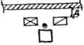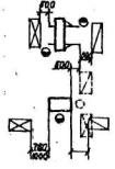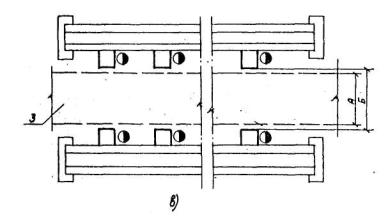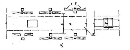 Рис. 1. Схема расположения станков, мест складирования (а), конвейеров (б), (в) и цеховых проездов 1 - место складирования заготовок; 2 - место складирования готовых деталей; 3 - цеховый проезд. А - ширина проезда; Б - расстояние между линиями станков и местами складирования и конвейерами; В - ширина рельсовой тележки. Таблица 22
