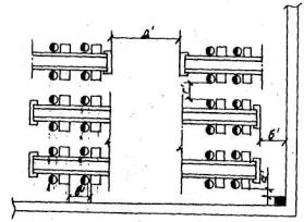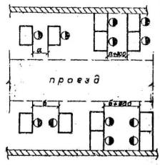 ПРИМЕЧАНИЯ: 1. При поперечном размещении верстаков в количестве более двух (по фронту) размеры расстояний между верстаками "а" и "б" превращаются в проезды и должны приниматься по табл. 22. 2. Верстаки допускается устанавливать у стен зa исключением случаев, когда у стены размещаются радиаторы, трубопроводы и т.п. 2.6.4. Нормы расстояний между станками и местами складирования для разных схем организации рабочего места приведены в табл. 21 Таблица 21
