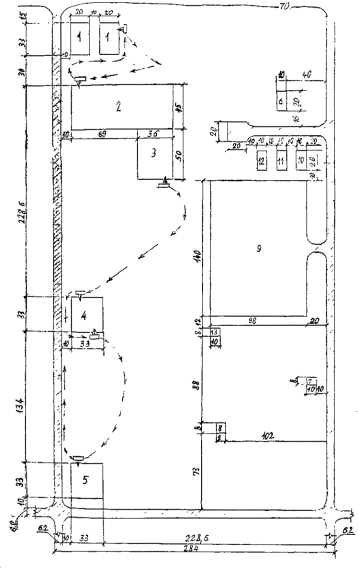 1. Склад отдельных труб; 2. Площадка для сборки и сварки секций; 3. Зона скатывания готовых секций; 4. Площадка для контроля качества сварных швов; 5. Погрузка готовых секций; 6. Санитарно-бытовые помещения; 7. Склад ГСМ; 8. Ампулохранилище радиоактивных изотопов; 9. Стоянка строительных машин и автотранспорта; 10. Мастерская; 11. Лаборатория контроля сварных швов; 12. Склад сварочных материалов, запчастей и др. 13. Туалет.