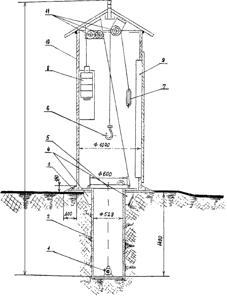 1. Источник излучения. 2. Колодец для хранения источника излучения. 3. Отростка. 4. Металлические косынки. 5. Крышка колодца. 6. Грузоподъемный крюк. 7. Кольцо для подъема и опускания. 8. Противовес. 9. Дверь. 10. Корпус хранилища. 11. Блоки.