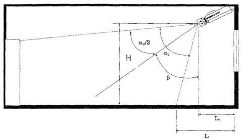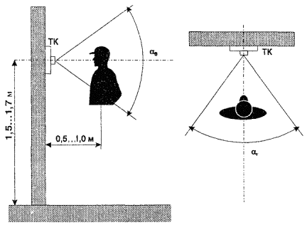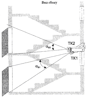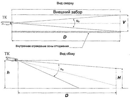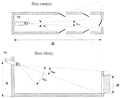 4.1.4 Синхронизация по сети питанияСинхронность работы всех ТК обеспечивает четкое (без срывов синхронизации видеомонитора) переключение камер. Это особенно важно при проведении записи на видеомагнитофон, так как время захвата синхронизации у него достаточно велико. Наиболее простым и удобным способом синхронизации ТК является синхронизация по сети питания. Этот способ предпочтителен еще и по другой причине. При освещении помещения лампами дневного света, освещенность в помещении колеблется с частотой 100 Гц, а информация с ПЗС-матрицы снимается с частотой 50 Гц. Но частота сети питания (ламп дневного света) может отличаться от 50 (± 1) Гц. В результате соседние полукадры снимаются в моменты разной освещенности помещения и, следовательно, яркость изображения на экране монитора будет "плавать". Для устранения данного эффекта следует снимать информацию с ПЗС-матрицы гарантированно в один и тот же момент времени. Это можно сделать только путем синхронизации ТК с частотой питающей сети. На предприятиях-изготовителях ТК настраивают на синхронизацию по переходу питающего напряжения через ноль. Однако при питании ТК от разных фаз трехфазной сети требуется проводить регулировку фазы синхронизации. Поэтому при выборе ТК необходимо соблюдать условие, чтобы в ней была предусмотрена возможность плавной (или ступенчатой) подстройки задержки фазы синхронизации. Наиболее простой способ настройки синхронизации ТК состоит в следующем: 1) одну из камер принимают за образцовую, а вторую - за регулируемую; 2) обе камеры подключают на один монитор - на два видеовхода или на один видеовход с помощью Т-соединителя; 3) с помощью регулировки монитора "Стабильность по горизонтали" добиваются однородного изображения; 4) с помощью регулировки монитора "Стабильность по вертикали" выводят на экран две черные полосы (импульсы вертикальной синхронизации); 5) регулировкой фазы синхронизации ТК совмещают указанные две полосы. В моделях ТК, которые питаются постоянным напряжением, стандартной является внутренняя синхронизация по кварцевому генератору. 4.1.5 Установка телевизионной камерыПри установке ТК следует руководствоваться следующими принципами: - камеру следует располагать на местности так, чтобы избежать возможных прямых засветок объектива яркими источниками света (солнце, фары машин и др.); - размешать ТК так, чтобы размеры "мертвой" зоны были минимальными (рисунок 2). Рисунок 2 - "Мертвая" зона ТК (вид сбоку) Размер "мертвой" зоны определяют по формуле