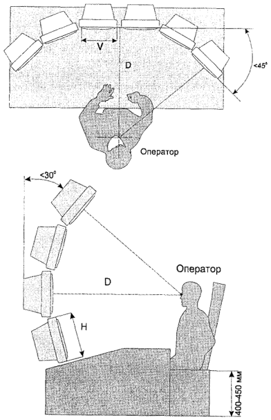 4.3.2 Настройка монитораБлагодаря наличию регулировок, монитор можно настраивать с учетом внешних условий и при правильной настройке - продлить срок службы электронно-лучевой трубки, избежать ее преждевременный выход из строя. Настройку монитора осуществляют в следующей последовательности: 1) устанавливают уровень освещения в помещении, соответствующим реальным условиям работы оператора (например, согласно требованиям санитарно-гигиенических норм); 2) устанавливают яркость и контрастность на минимум; 3) увеличивают яркость до появления слабо заметного свечения по всему монитору; 4) через несколько секунд (когда привыкнут глаза) снова уменьшают яркость до исчезновения свечения монитора; 5) снова увеличивают яркость до появления слабого свечения монитора; 6) увеличивают контрастность до появления четко наблюдаемого изображения. Примечание - Чрезмерная контрастность приводит к уменьшению четкости (расплыванию) изображения. 4.3.3 Количество и расположение мониторовВ информационном поле рабочего места оператора различают три зоны: · Зона 1 - с углами обзора ±15° по горизонтали и вертикали. В этой зоне располагают очень часто используемые мониторы, требующие быстрого и точного анализа информации (например идентификации). На них рекомендуется выводить ТК, установленные в особо важных (или опасных) зонах объекта. В зоне 1 обычно умещается (в зависимости от расстояния наблюдения) от четырех до девяти мониторов (по два или три монитора в вертикальном и горизонтальном полях); - Зона 2 - с углами обзора ± 30° по горизонтали и вертикали. В этой зоне располагают часто используемые мониторы, требующие менее точного и быстрого анализа информации (например различения). В зоне 2 может быть размещено от 12 до 27 мониторов; - Зона 3 - с углами обзора ± 60° по горизонтали и вертикали. В этой зоне располагают редко используемые мониторы (например, включаемые по тревоге или вручную оператором). Мониторы должны находиться на одинаковом расстоянии от оператора, т.е. располагаться по сферической поверхности (рисунок 3). Следует особо отметить, что анализировать изображения, поступающие с нескольких мониторов одновременно, оператор практически не в состоянии - очень высока вероятность ошибки. Поэтому устанавливать для одного оператора более четырех мониторов не рекомендуется. Да и в этом случае целесообразно, чтобы оператор внимательно наблюдал один монитор, а на другие - переключал внимание при возникновении нештатных ситуаций. При размещении мониторов на рабочем месте оператора необходимо также учитывать следующие требования: - при потолочном освещении помещения, в котором расположены видеомониторы, рекомендуется устанавливать на экраны козырьки (чтобы оператор не увеличивал яркость и контраст изображения на мониторе); - при необходимости местного освещения светильники должны иметь непрозрачные плафоны и быть расположены так, чтобы свет от них не попадал на экран монитора; - использовать на мониторах специальные антибликовые экраны; - не допускать попадания на экран монитора прямого или отраженного света от ярких источников. Нельзя располагать мониторы напротив окна или источников яркого искусственного освещения. Стол оператора Рисунок 3 - Схема рабочего места оператора 4.4 КОНТРОЛЬНОЕ ОБОРУДОВАНИЕКонтрольное оборудование включает в себя все ус