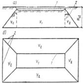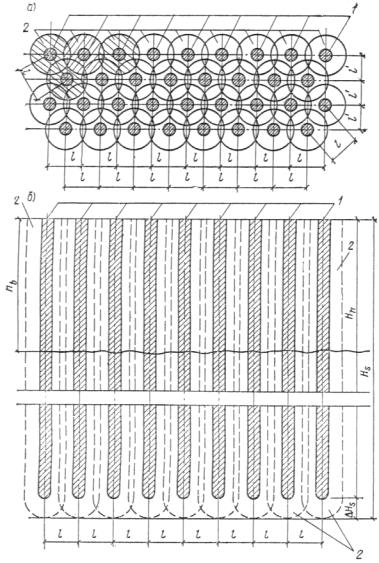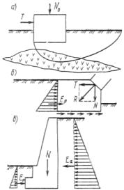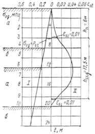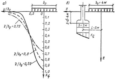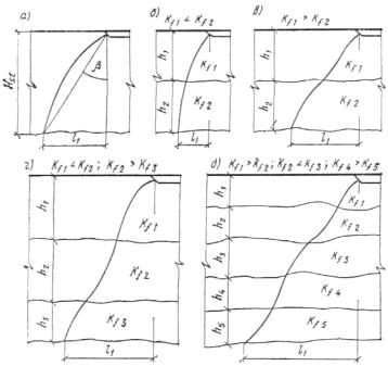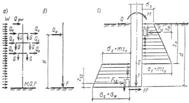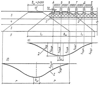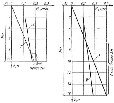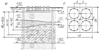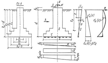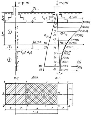 Рис. 1. К выбору расчетной схемы «здание - основание»» а - здание повышенной этажности с фундаментами в виде сплошной плиты на основании с переменной сжимаемостью по глубине; б - протяженное здание с ленточными фундаментами на основании с переменной сжимаемостью в плане При расчете несущих конструкций здания на ветровые нагрузки в качестве расчетной схемы в данном случае принимается многоэтажная рама с жесткой заделкой стоек в уровне верха фундаментной плиты. Для определения усилий в фундаментной конструкции расчетная схема принимается в виде плиты конечной жесткости на линейно-деформируемом слое. При вычислении крена плиты ее жесткость можно принять бесконечно большой. При определении средней осадки плиты, а также при расчете несущей способности основания допускается пренебречь жесткостью плиты и считать давление на основание распределенным по линейному закону. Для расчета конструкций протяженного крупнопанельного жилого дома, имеющего в основании напластование грунтов с ярко выраженной неравномерной сжимаемостью (рис. 1, б), целесообразно принять расчетную схему в виде равномерно загруженной балки конечной жесткости на основании с переменным коэффициентом жесткости. Нагрузки и воздействия, учитываемые в расчетах оснований2.13(2.5). Нагрузки и воздействия на основания, передаваемые фундаментами сооружений, должны устанавливаться расчетом, как правило, исходя из рассмотрения совместной работы сооружения и основания. Учитываемые при этом нагрузки и воздействия на сооружение или отдельные его элементы, коэффициенты надежности по нагрузке, а также возможные сочетания нагрузок должны приниматься согласно требованиям СНиП по нагрузкам и воздействиям. Нагрузки на основание допускается определять без учета их перераспределения надфундаментной конструкцией при расчете: а) оснований зданий и сооружений III класса; 1 б) общей устойчивости массива грунта основания совместно с сооружением; в) средних значений деформаций основания; г) деформаций оснований в стадии привязки типового проекта к местным грунтовым условиям. 1 Здесь и далее класс ответственности зданий и сооружений принят согласно Правилам учета степени ответственности зданий и сооружений при проектировании конструкций, утвержденным Госстроем СССР постановлением от 19 марта 1981 г. № 41. 2.14. При проектировании оснований следует учитывать, что сооружение и основание находятся в тесном взаимодействии. Под влиянием нагрузок от фундаментов основание деформируется, а это в свою очередь вызывает перераспределение нагрузок за счет включения в работу надфундаментных конструкций. Характер и степень перераспределения нагрузок на основание, а следовательно, и дополнительные усилия в конструкциях сооружения зависят от вида, состояния и свойств грунтов, характера их напластования, статистической схемы сооружения, его пространственной жесткости и многих других факторов. 2.15. Основными характеристиками нагрузок являются их нормативные значения, устанавливаемые СНиП по нагрузкам и воздействиям. Все расчеты оснований должны производиться на расчетные значения нагрузок, которые определяются как произведение нормативных нагрузок на коэффициент надежности по нагрузке gf, учитывающий возможное отклонение нагрузок в неблагоприятную сторону от нормативных значени