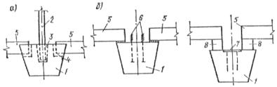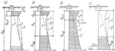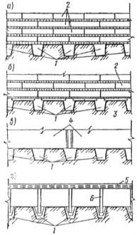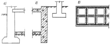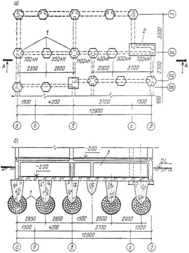 где s1 - расчетная осадка опоры при давлении p1 = R [(R - расчетное сопротивление основания, определяемое по указаниям пп. 2.174 - 2.204(2.41 - 2.48)]; pu - предельное сопротивление основания - давление на основание, соответствующее исчерпанию его несущей способности [см. пп. 2.261 - 2.228(2.57 - 2.65)]. Расчет конструкций сооружений во взаимодействии с нелинейно-деформирующимся основанием выполняется с применением ЭВМ. Пример выбора расчетной схемы системы сооружение - основание. Каркасно-панельное здание повышенной этажности, проектируемое на площадке, где в верхней зоне основания залегают пылеватые пески и суглинки с модулем деформации Е = 15 - 20 МПа, подстилаемые известняками с модулем деформации Е = 120 МПа, имеет фундамент в виде коробчатой железобетонной плиты (рис. 1, а)
