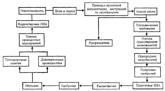 ПРИЛОЖЕНИЕ 9ПОРЯДОК СОСТАВЛЕНИЯ ПЛАНОВ ЛИКВИДАЦИИ АВАРИЙ НА ВЗРЫВОПОЖАРООПАСНЫХ ОБЪЕКТАХ1. План ликвидации аварий (ПЛА) должен быть составлен на каждый взрывопожароопасный объект или его взрывопожароопасный участок, цех и т.п. 2. В ПЛА должны предусматриваться: 2.1. Возможные аварии, места их возникновения и условия, опасные для жизни людей; 2.2. Мероприятия по спасению людей, застигнутых аварией; 2.3. Мероприятия по ликвидации аварий в начальной стадии их возникновения, а также первоочередные действия производственного персонала при возникновении аварий; 2.4. Места нахождения средств для спасения людей и ликвидации аварий; 2.5. Порядок взаимодействия с газоспасательными, пожарными и противофонтанными отрядами. 3. ПЛА разрабатываются комиссией, состоящей из специалистов, назначенных приказом по предприятию. ПЛА пересматриваются ежегодно. При изменении технологии, условий работы, правил безопасности в ПЛА должны быть в трехдневный срок внесены соответствующие изменения и дополнения. 4. ПЛА в количестве пяти экземпляров утверждается техническим руководителем предприятия при наличии актов проверки: состояния систем контроля технологического процесса; состояния вентиляционных устройств; наличия и исправности средств для спасения людей, противопожарного оборудования и технических средств для ликвидации аварий в их начальной стадии; исправности аварийной сигнализации, связи, аварийного освещения. 5. ПЛА должен содержать: 5.1. Оперативную часть, в которой должны быть предусмотрены вес виды возможных аварий на данном объекте, определены мероприятия по спасению людей и ликвидации аварии, а также лица, ответственные за выполнение мероприятий, и исполнители, места нахождения средств для спасения людей и ликвидации аварий, действия газоспасателей, пожарных и других подразделений; 5.2. Распределение обязанностей между отдельными лицами, участвующими в ликвидации аварии; 5.3. Список должностных лиц и учреждений, которые должны быть немедленно извещены об аварии; 5.4. Схемы расположения основных коммуникаций (технологическая схема) в соответствии с требованиями п. 3.13.1.6 настоящих Правил; 5.5. Списки инструментов, средств индивидуальной защиты, материалов, находящихся в аварийных шкафах (помещениях) с указанием их количества и основной характеристики. 6. В оперативной части ПЛА должны быть предусмотрены: 6.1. Способы оповещения об аварии (сирена, световая сигнализация, громкоговорящая связь, телефон и др.), пути выхода людей из опасных мест и участков в зависимости от характера аварии; 6.2. Действия лиц технического персонала, ответственных за эвакуацию людей и проведение предусмотренных мероприятий; 6.3. Режим работы вентиляции при возникновении аварии, в том числе включение аварийной вентиляции (при наличии); 6.4. Необходимость и последовательность выключения электроэнергии, остановки оборудования, аппаратов, перекрытия источников поступления вредных и опасных веществ; 6.5. Выставление на путях подхода (подъезда) к опасным местам постов для контроля за пропуском в загазованную и опасную зоны; 6.6. Способы ликвидации аварий в начальной стадии. Первоочередные действия технического персонала по ликвидации аварий (пожара), предупреждению увеличения их размеров и осложнений. Осуществление мероприятий по предупреждению тяжелых последствий ав