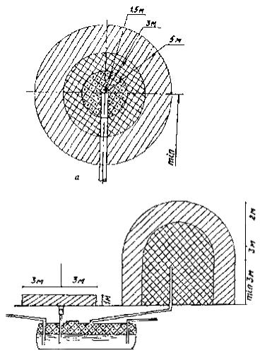 Рис. 8. Открытые пространства вокруг окончания труб, отводящих попутные газы (а), и отверстий для выпуска газов (паров) из закрытых технических устройств (в)