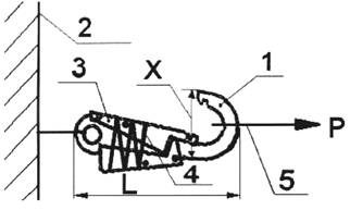 1 – основной крюк карабина; 2 – неподвижная опора; 3 – внутренняя рукоятка карабина; 4 – проволока D = 1 – 1,5 мм для закрепления рукоятки в указанном положении; 5 – растягивающее усилие (500±1 кгс); Х – расстояние между наружной поверхностью носка крюка карабина и наружной поверхностью тыльной стороны крюка карабина; L – длина карабина, измеренная по оси приложения нагрузки.
