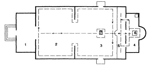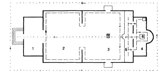 1 - притвор (2 - трапезная часть); 3 - средняя часть; 4 - алтарь; 5 - солея; 6 - престол; 7 - аналой; ®- - - - передвижение священнослужителей во время богослужения [5]; ®..... - передвижение клириков и мирян во время Крестного хода ПРИЛОЖЕНИЕ ЖСХЕМАТИЧЕСКАЯ МОДЕЛЬ ПРАВОСЛАВНОГО ХРАМА С СИМВОЛИЧЕСКИМ ЗНАЧЕНИЕМ ЕГО ЭЛЕМЕНТОВ