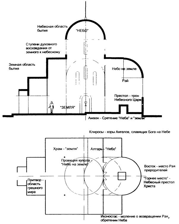 Духовная реальность храма выражается в его архитектуре посредством символов. Исходя из догматического учения Православной Церкви о будущем преобразовании неба и земли в Царство Божие храм в целом символизирует собой Небесное Царство, возвращенный оправданному человечеству Рай. В планировочном отношении алтарь являет образ Рая, духовного мира, нисходящего на землю к людям. Средняя часть храма является символом неба и земли, вселенной, обновленных примирением с духовным миром. Притвор является символом мира неоправданного, греховного. Согласно церковной теории соотношения образа с первообразом архитектурные образы и символы храма при исполнении в рамках канонической традиции могут отражать первообразы небесного бытия и приобщать к ним. ПРИЛОЖЕНИЕ ИПРИМЕРЫ ХРАМОВ, СООТВЕТСТВУЮЩИХ ЦЕРКОВНО-КАНОНИЧЕСКИМ ТРЕБОВАНИЯМ1 Великая Успенская Печерская церковь в Киево-Печерском монастыре (XI в.) 2 Успенский собор на Городке в Звенигороде (XV в.) 3 Церковь Трифона в Москве (XV в.) 4 Церковь Петра митрополита Высокопетровского монастыря в Москве (XVI в.) 5 Церковь Спаса в Уборах под Москвой (XVII в.) 6 Церковь Косьмы и Дамиана в Москве (XVIII в.)