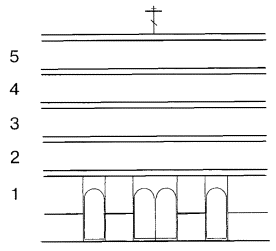 1 ярус - Местный с диаконскими и «Царскими вратами»; 2 ярус - Деисусный; 3 ярус - Праздничный; 4 ярус - Пророческий; 5 ярус - Праотеческий; верх - Распятие ПРИЛОЖЕНИЕ МРАСЧЕТ РЕВЕРБЕРАЦИИ В ПОМЕЩЕНИЯХ ХРАМОВАкустическое проектирование должно быть ориентировано на оптимизацию времени реверберации, определяющего гулкость звучания храмовых помещений, методика которого разработана институтом НИИСФ. Время реверберации Т, с, рекомендуется рассчитывать по формуле Эйринга: