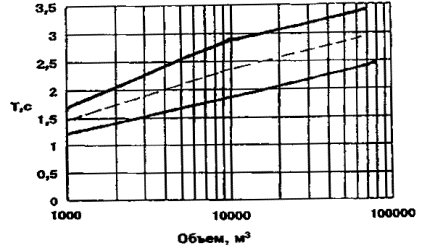 Примечание - В помещениях с обилием деревянных конструкций и гибких элементов следует увеличить aдоб на 30 % в диапазоне 125 - 250 Гц, а при значительном количестве мелких членений, отверстий и тканевых деталей интерьера - на 30 % в диапазоне свыше 500 Гц. На графике рисунка М.1 приведена зависимость оптимумов времени реверберации от объема помещений в диапазоне 500 - 2000 Гц. Учитывая, что время реверберации зависит от степени заполнения храмов прихожанами, оптимальные значения времени реверберации должны укладываться в границах, верхний предел которых соответствует заполнению 6 м2/чел., а нижний - 0,25 м2/чел. На частотах 125 - 250 Гц допускается подъем времени реверберации на 25 - 30 %, а на частоте 4000 Гц - снижение на 15 - 20 %. Рисунок M.1 - Рекомендуемое время реверберации на средних частотах для храмовых помещений в зависимости от их объема - - - - линия оптимумов ----- - зона допусков В случае если расчет времени реверберации по формулам (М.1) - (М.3) покажет значения, выходящие из рекомендуемых по рисунку М.1, то следует провести корректировку объемно-планировочного решения и материалов отделки интерьеров проектируемого храма. При избыточных значениях времени реверберации (при недостаточности общего фонда звукопоглощения) следует, во-первых, уменьшить воздушный объем помещения при неизменности площади пола основного и боковых нефов и, во-вторых, увеличить звукопоглощающие свойства материалов отделки интерьеров. Если проведенный контрольный расчет времени реверберации по-прежнему покажет избыточные значения времени реверберации, то следует принять дополнительные меры к увеличению фонда звукопоглощения храма. При значительном превалировании времени реверберации в диапазоне низких частот можно использовать «голосники», выполненные по современной строительной технологии, методы расчета которых приведены в издании [9]. В диапазоне средних и высоких частот для увеличения звукопоглощения рекомендуется использовать тканевые элементы убранства храма. Их общее количество определяется акустическим расчетом. При недостаточности времени реверберации храма следует принять меры к увеличению его общего воздушного объема и к уменьшению фонда звукопоглощения в убранстве храма. При выборе объемно-планировочных решений храмов кривизну куполов и сводов следует выбирать так, чтобы их центры размещались значительно выше отметки пола (не ниже уровня +3,0 м по отношению к уровню пола алтаря и солеи). В храмах с делением на средний и боковые нефы или трапезную часть, особенно при высоком центральном куполе, статистический метод расчета времени реверберации неприменим. Расчет