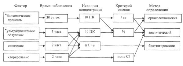 Растворы веществ готовятся на дехлорированной водопроводной воде. Исходная концентрация зависит от метода определения. При химико-аналитическом определении исходная концентрация ³ 10 ПДК, при органолептическом - исходная концентрация должна создавать изменение органолептических свойств интенсивностью 4-5 баллов, при биотестировании концентрации должны быть близкими CL50 исходного вещества для изучаемого тест-объекта. Выбор интенсивности и длительности воздействия трансформирующих факторов определяется решением двух задач. При максимальном воздействии выясняют, вызывает ли этот фактор уменьшение содержания вещества, и какие продукты трансформации образуются при максимально разрушении вещества. Если в этих условиях не обнаруживается эффект трансформации, исследования прекращаются. При иных результатах исследуется действие факторов, по интенсивности близкое к реальному. 5.4.1. Изучение влияния ультрафиолетового облучения проводят в кварцевом стакане объемом 0,75 л. Мощность ультрафиолетовой лампы - 6 квт, расстояние от освещаемой поверхности воды - 15 см, объем раствора 0,5 л, время воздействия - 3 часа. Критерий оценки - процент деструкции за исследуемый период времени. 5.4.2. Влияние озонирования изучается в реакторе с механической мешалкой. Осушенный воздух пропускается через озонатор и с помощью барботера - через исследуемый раствор. Напряжение в озонаторе - 8 кВт. Скорость подачи озона в раствор - 18 мг/час. Длительность воздействия - 3 часа и/или 30 минут. Контроль за содержанием озона в воде - иодометрический, концентрация озона в растворе 0,5-1,5 мг/л, остаточный озон - 0,1-0,3 мг/л. Для летучих веществ воздействие озонирования оценивается путем смешения с водой, содержащей 0,5-1,5 мг/л озона. Критерий оценки - процент деструкции вещества. 5.4.3. Гидролиз при кипячении изучается в растворах, приготовленных на дистиллированной воде. Кипячение в течение 2-х часов и/или 5 мин. с обратным холодильником. Критерий оценки - процент деструкции вещества за время воздействия. 5.4.4. Изучение влияния хлорирования на структуру вещества проводится согласно [3]. Начальная концентрация хлора - 3 мг/л, при перехлорировании - 10 мг/л. Максимальное время воздействия - 2 часа. Можно определять дополнительно воздействие хлора через 15. 30 и 60 мин. 5.5. Класс опасности веществ по стабильности определяется последовательно на основании комплексной оценки по табл. 5.2. В качестве лимитирующего показателя стабильности химического агента принимается t1/2 в модельном водоеме или показатели биоразлагаемости. Оценка опасности продуктов трансформации - по результатам опытов с дополнительными деструктирующими факторами. 5.6. Для веществ 3 и 4 классов стабильности на первое место выступает сравнительная оценка опасности исходного вещества и продуктов трансформации. 5.7. Если вещество разлагается с образованием ранее не нормированных в воде компонентов, помимо ПДК исходного соединения обосновываются нормативы и для продуктов его трансформации. 6. Определение пороговых концентраций по влиянию веществ на органолептические свойства водыОрганолептические свойства воды - воспринимаемая рецепторами человека совокупность показателей качества воды: запах, привкус, окраска, прозрачность (мутность), наличие пленок или пены на поверхности воды, посторонних включений, плавающих приме