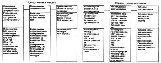 Условные обозначения: МКА - Москомархитектура АПУ АО - Архитектурно-планировочное управление административного округа ЧС - чрезвычайные ситуации ПФ - префектура МКП - Москомприрода МГЦСЭН - Московский государственный центр Санэпидемнадзора ЗП - землепользователи ЭСИК - эксплуатационные службы инженерных коммуникаций ДС - Департамент строительства ДЭПиР - Департамент экономической политики и развития Москвы ДФ - Департамент финансов АО МКС - АО «Москапстрой» ИНВ - инвестор МГЭ - Мосгосэкспертиза УГК и ОП - Управление государственного контроля и охраны памятников НИиПИ Генплана - Научно-исследовательский и проектный институт Генплана Москвы ОПС - отдел подземных сооружений УПО - управление пожарной охраны МГЛП - Мосгослесопарк ЗО - заинтересованные организации ЭО - эксплуатирующие организации ГСО - генподрядная строительная организация ЗИ - заводы-изготовители МКИ - Москомимущество Приложение 2 Порядок проведения работ и услуг по согласованию Согласования предпроектных и проектных документов в зависимости от назначения могут носить: - общий характер; - корректирующий характер; - целевой характер. К согласованиям общего характера относятся работы и услуги по оформлению документов по отводу земельных участков; принципиальных проектных решений (соответствие их нормам, правилам, инструкциям), исходных данных, технических условий на присоединение инженерных сетей, согласование с пользователями земельных участков и т.д. Согласование общего характера производятся только один раз при разработке ПДП, ЭП, ТЭО, градостроительного задания и задания на проектирование. Согласования корректирующего характера производятся на любой стадии проектирования в тех случаях, если допущено отступление от условий представления земельного участка, ранее согласованных принципиальных решений, изменения технических условий и т.д. Необходимость проведения целевых согласований возникает в ситуациях, когда по тем или иным причинам допущено отступление от нормативных документов, утвержденных проектных решений и т.д. Процедура работ и услуг по согласованию не зависит от принадлежности строительства по формам собственности (муниципальное, министерств и ведомств, коммерческое). Исчерпывающая информация о порядке работ и услуг по согласованию, экспертизы и утверждения проектной и предпроектной документации изложена в разделе 5 «Положения о едином порядке предпроектной и проектной подготовки строительства в Москве». Организации, осуществляющие работы и услуги по согласованию подразделяются на 4 группы: - экспертирующие организации; - органы государственного надзора; - эксплуатирующие организации; - заинтересованные организации. К экспертирующим организациям относятся: Мосгосэкспертиза, Москомприрода, Управление градостроительного совета и согласования проектов Москомархитектуры, а также ведомственная экспертиза. Экспертирующие организации рассматривают предпроектную и проектную документацию. Заключения экспертирующих организаций являются окончательными. Органы государственного надзора рассматривают только проектную документацию с позиций соответствия действующим нормам и правилам. Эксплуатирующие организации согласовывают проектную документацию в целях достижения соответствия принятых решений выданных ими техническ