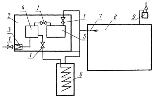 3.3.1. Емкость испарителя с помощью вентиля 1 заполняют на 3/4 объема амилом или гептилом, затем емкость увлажнителя заливают дистиллятом (конденсатом).