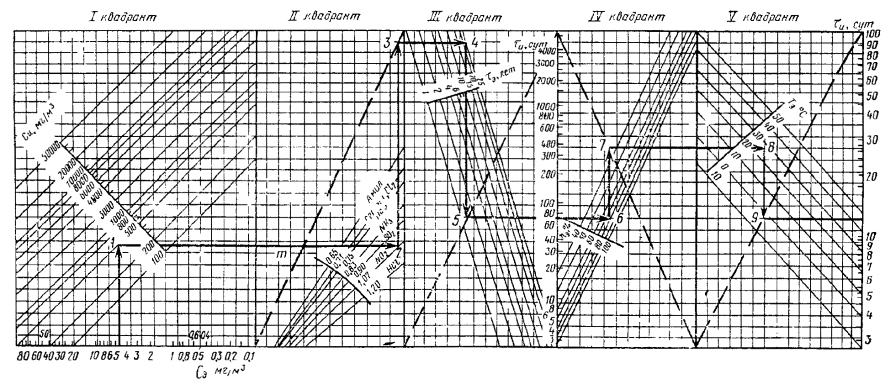 из точки 9 проводят горизонталь до пересечения с вертикальной шкалой пятого квадранта, по которой определяют значение tи. В данном случае продолжительность испытаний в режиме Ти = (50±2) °C, hи = (98±2) %, Cи = 500 мг/м3 составляет tи = 12 сут.