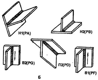 Н1 - нижнее; Н2 - нижнее тавровых соединений; В1 - вертикальное (сварка снизу вверх); В2 - вертикальное (сварка сверху вниз); Г - горизонтальное; П1 - потолочное, П2 - потолочное тавровых соединений